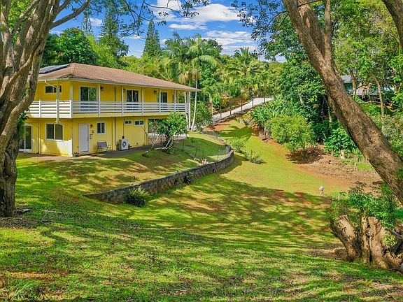 Embrace nature and tranquility in this exquisite custom-built Eddie Soltren home, nestled on 1.19 acres of rolling land, flourishing with mature trees, exotic foliage, and tropical birds. This quality two-story home, conveniently located within close distance to Hoopii falls trailhead offering access to three breathtaking waterfalls and a serene swimming hole.<br><br>Wrapped in a solid ipe wood lanai, this immaculately maintained home exudes charm and showcases quality craftsmanship. Enjoy modern comforts with new split duct AC, solar hot water system, stainless steel refrigerator, ceiling fans, brushed nickel accents and fixtures, Moen faucets, and a stainless steel kitchen sink. The well-appointed kitchen boasts solid wood DeWils cabinetry, granite countertops, new appliances, and a walk-in pantry.<br><br>Upstairs offers three bedrooms and two bathrooms. The open floor plan features vaulted ceilings and an abundance of natural light, providing a welcoming atmosphere. A covered lanai allows access into every upstairs room including the living room and offers a spectacular view of the Garden of Eden type landscaping. The downstairs area is a second living or work area. Recent upgrades include waterproof wood laminate flooring, new bathroom fixtures, lighting updates, a fridge, oven, and updated ceiling fans and lighting.<br><br>Outside you will discover a stunning exterior with its meticulously landscaped grounds, garden area, and vast array of fruit trees including: mac nut, soursop, naval oranges, blood oranges, suriname cherries, lemon, ulu, longan, papaya, jabuticaba, rambutan, avocado, tangerine to name a few. Don't miss the opportunity to own this one-of-a-kind gem that harmoniously blends nature, privacy, and modern living.<br><br>Copy and paste the link below view 30 more photos and a 3D tour.<br>***https://www.aryeo.com/v2/YOMRKBN/unbranded***