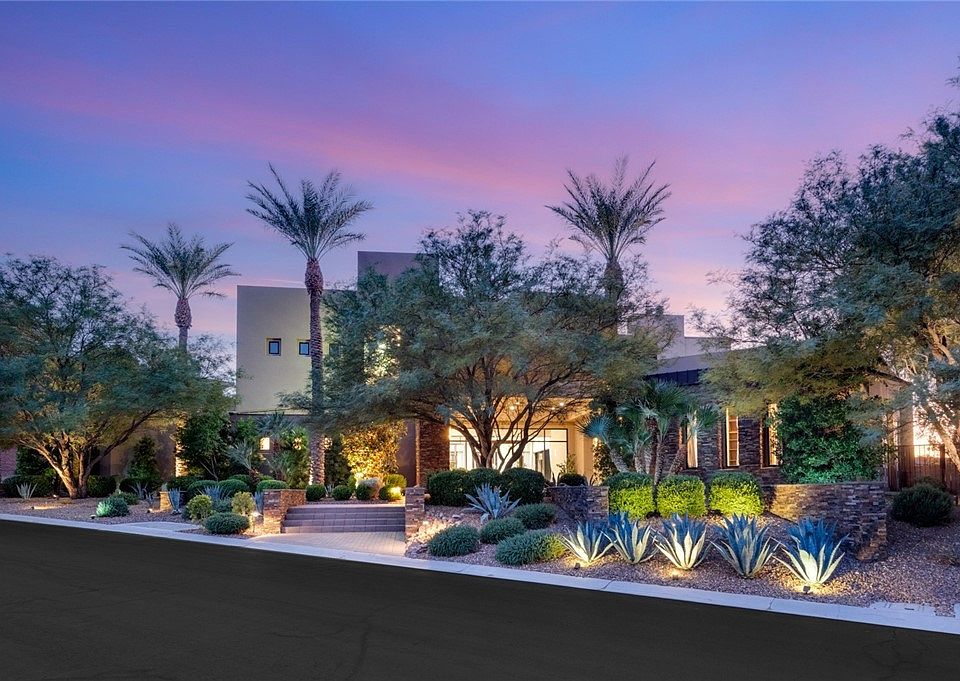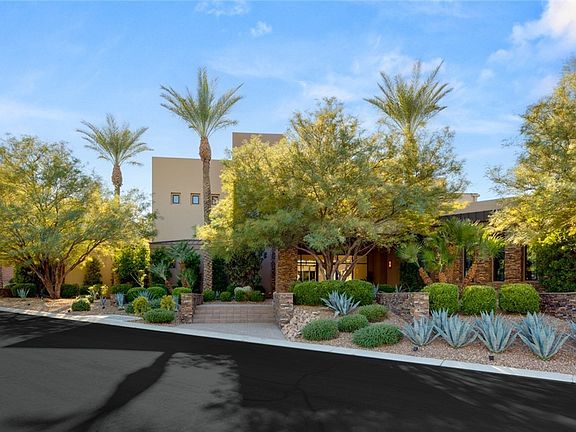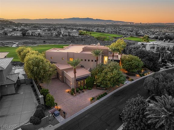 THE VIEW - Perched high in MacDonald Highlands, this custom masterpiece offers sweeping Strip and golf course views from multiple observation decks. Spanning 9,614 sq ft on over a half-acre, the home features 5 bedrooms, 7 baths, and a 4-car side-loading garage. The open layout is filled with natural light and refined designer finishes throughout. The main-level primary suite opens through corner pocket doors to a resort-style yard with infinity-edge pool, spa, covered lounge with fireplace, and outdoor kitchen. Inside, a chef’s kitchen boasts dual islands, top-tier appliances, and double sinks. A game room with bar, acoustically treated theater with eight lounge chairs, elevator, and elegant dining area with wine display complete the design. Set within one of Las Vegas’ most prestigious guard-gated communities, this is a rare opportunity to own a home that seamlessly blends modern luxury, architectural beauty, and breathtaking views.