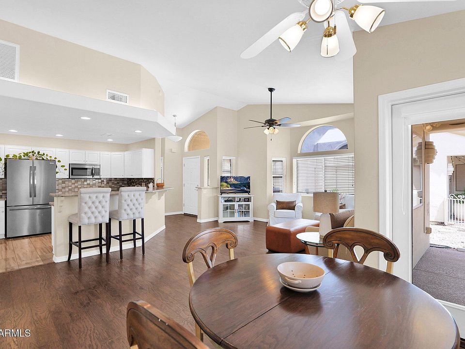 Upgrades include granite countertops, upgraded flooring throughout, a frameless glass walk-in shower in the primary bath, and new appliances. Enjoy added convenience with kitchen cabinet pull-outs, a newer roof (2-3 years), and fresh exterior paint (2023). Located in the 55+ gated community of Apache Wells II, close to shopping, dining, golf, Saguaro Lake, and more.