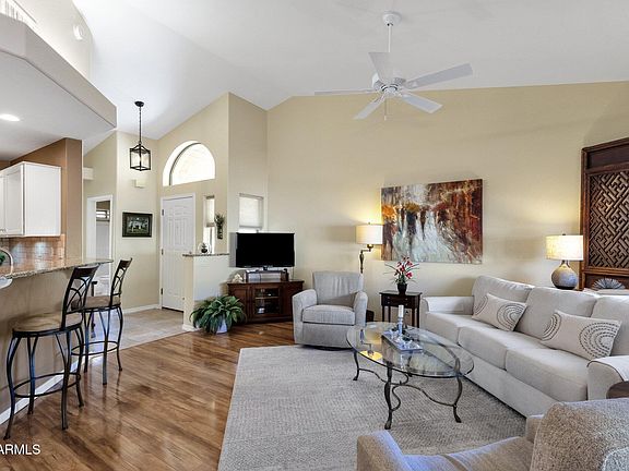 This charming 2BR/2BA patio home is vacant & move-in ready! Popular GATED 55+ community. Well-maintained home sits on quiet street and features an open floor plan, spacious rooms. Updated kitchen has stainless appliances, granite counters, stone backsplash, breakfast bar. Large dining area w/ bay window. Primary suite has walk-in closet, bath w/ granite vanity, dual sinks. 2nd BR has walk-in closet & bay window. Private access to 2nd bath is perfect for guests. Beautiful wood laminate flooring. Ceiling fans throughout. Quiet backyard w/ covered patio. 2-car garage w/ storage cabinets. Water softener. Fridge/washer/dryer convey. Community has heated pool/spa, clubhouse, fitness center, library. HOA Fee incl. water, trash, front/back landscaping, basic Cox Cable.