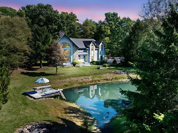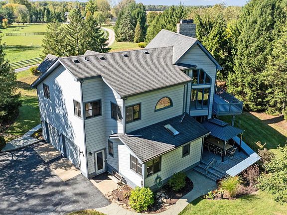 Escape the bustle & congestion while being on 6.2 scenic acres just 15 minutes from Bridge Park and Rails to Trail bike/walking path. The property includes a 4-stall horse barn with a big 500 bale loft and power & water plus 2 paddocks and 3 separated pastures (total pasture area is approximately 2.5 acres), and a pond complete with fish & a dock. Ideal for hobby farmers, gardeners, animal lovers or anyone dreaming of a home-based workshop or art studio. All this plus a light-filled contemporary styled home with high ceilings and open spaces. Stone fireplace is double-sided to living room/dining room. Lovely wood floors on the 1st floor make the space flow. Kitchen has more than enough cabinets and work area for any cook plus a breakfast spot with a great view towards the yard and paddock area. Upstairs is unique with a family room/multi-use space with stone fireplace overlooking the living room. The large primary suite with its ensuite bath has viewing doors that can open to this space so fireplace can be enjoyed. Two other bedrooms complete the second floor along with another full bath. The closet space through-out is ample. The basement has a high ceiling and can easily be finished for more space. Home has 2 hotwater tanks, 2 HVAC systems, a 300amp total with 2 150amp electric panels, a 200' well, and a 3/4'' water line. The garage is heated and cooled & also has hot & cold water spigots - ideal for a workshop. The acreage behind the house has mature woods with many paths for riding or walking. Truly an exceptional property!