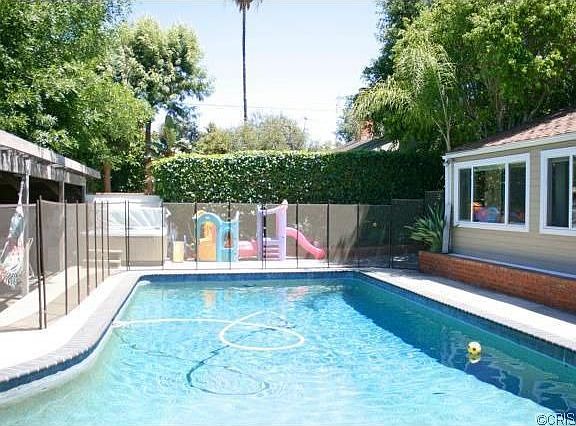 Updated single story pool home in great area, on quiet tree lined street with no through traffic, within walking distance of synagogue,Valley College, and more. Recently remodeled kitchen features granite counters and tile backsplash, stainless steel appliances and under mount sink, water filtration system. Hardwood floors throughout. Custom window blinds. Laundry room off kitchen. Enclose patio off living room( no permit). Entertainers backyard features updated child safety fenced pebble tech pool with pool sweep, separate hot tub, custom free standing gazebo with recessed lights, and viewing deck off of master. Customized closets in master and garage, newer water heater, garage door opener motor(3 remotes). Timed sprinkler system, soft water system, alarm system, and timed landscape lights in front garden. All meticulously maintained!