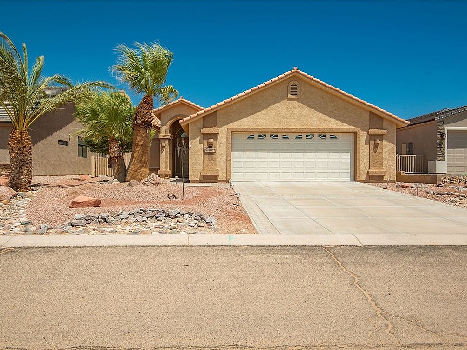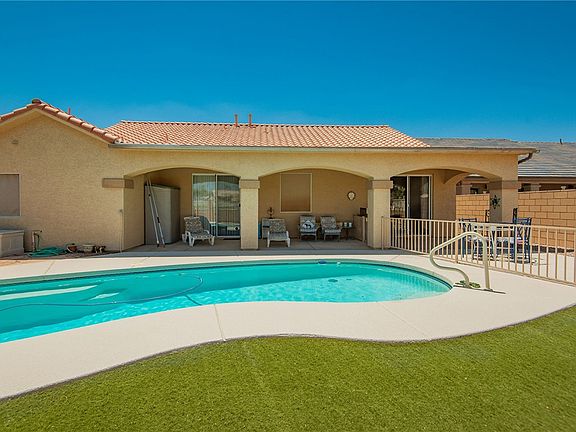 Located at 5832 S Wishing Well Dr, Fort Mohave, Arizona, this residence on the Huukan Golf Course presents an attractive property in great condition, poised to become your personal haven. 3 bedrooms plus a den that could easily be converted to a fourth bedroom. The formal living room serves as a captivating centerpiece, defined by its high ceiling, creating an airy and expansive atmosphere; the fireplace offers a warm and inviting focal point, perfect for gatherings or quiet evenings spent in tranquil reflection. The primary bedroom provides a private retreat, with access to the backyard oasis and your spa-like ensuite. Within the ensuite bathroom, the double vanity and tiled shower combine functionality with style, crafting a space for relaxation and rejuvenation. The kitchen is thoughtfully designed, offering ample space for meal preparation and casual dining at the kitchen bar or in the designated dining space. Large walk-in pantry and the utility room add to the functionality of this home. Enjoy the outdoors with your own private pool and covered patio, perfect for relaxation and recreation, while enjoying both golf course and mountain views. The garage space alone is its own WOW factor! BOAT DEEP GARAGE, custom flooring, and enough space for all of your desert and water toys! Located near all of the necessities and fun this house is ready for you to make it your home!