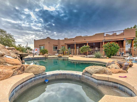 This Santa Fe style, 3000 plus sq.foot with 1.15 acres of land is ready for new ownership.Zoned for 2 farm animals.Class and spectacular views make this home ideal for anyone looking for an escape from the hustle and bustle of the city and still within driving distance of anything your heart desires. The interior of the home is a perfect collection of western style decor, from the tile to real wood beams, this home will knock your boots off. The kitchen boasts hickory cabinets, granite counters, wall ovens, a propane gas cooktop and more. The master is fully equipped with a glass block shower, dual vanity and a huge soaking tub. Out back enjoy the views of the majestic Superstitions Mts. and a sparkling pool with a built in spa & slide