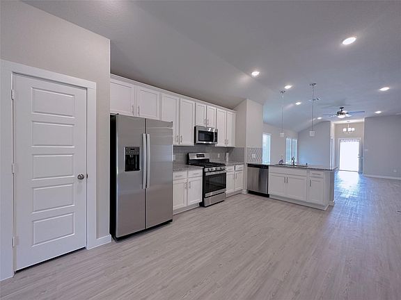 MOVE IN READY! This is a stunning home that embodies open-concept living. Washer, dryer and refrigerator will be provided! The main living area is flooded with natural light, seamlessly connecting the family room, kitchen, and dining area. Privacy is key in the grand owner's suite, tucked away at the rear of the home and boasting sloped ceilings, making the room more airy. The owner's bathroom features a walk-in shower and a sizable closet. The front of the house is home to the additional bedrooms, which share a second bathroom. Outdoor enthusiasts will love the covered patio, which is perfect for achieving your backyard goals. This home also has 2 side brick fences and a corner lot. Close to the lake, park, and splash pad, this property offers the ideal lifestyle. Don't miss the opportunity to view this gem a " book a showing today!