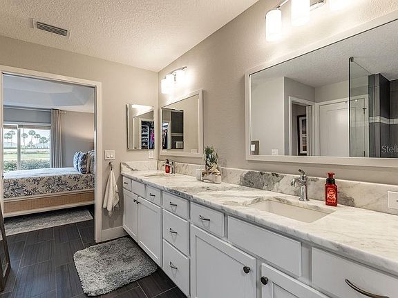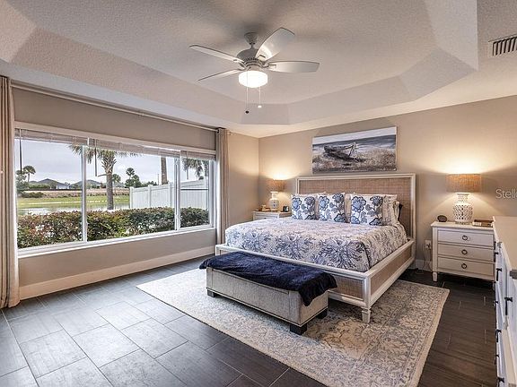 Welcome Home! PRICED TO SELL!!! PREMIUM WATER FRONT SITE!!! HIGH END UPGRADED BLOCK AND STUCCO Maybury VERANDA MODEL. ROOM FOR A POOL!! Discover the perfect blend of comfort and elegance in this stunning 3-bed 2-bath Maybury Model Veranda Home located in the highly desirable Village of Hawkins. As you approach, the beautifully upgraded landscaping and covered arch entryway welcomes you to this TRULY ONE OF A KIND PEACEFUL OASIS! Step inside to an inviting foyer leading to an open and split floor plan, ensuring privacy with guest bedrooms conveniently situated at the front of the home. The guest area features all the comforts needed for a restful night and for added convenience, shares a well-appointed bath complete with a tub-shower combo, making it ideal for family and friends. Throughout the home, you'll find stunning ceramic tile floors that add both beauty and easy maintenance. The heart of this home is its spacious open concept living room right next to the water; perfect for entertaining or relaxing with loved ones. The kitchen is a chef's dream, boasting an island with a breakfast bar, high end stainless steel appliances, a gas stove, pull-out cabinet shelves for easy access to your essentials and breathtaking lighted upper accent cabinets! This home is TRULY A SHOW-STOPPER! Under-cabinet lighting, including a soft glow along the floor, enhances the ambiance while showcasing the stunning granite countertops and backsplash. The private and HUGE primary bedroom offers a serene retreat, complete with a tray ceiling for added elegance. The oversized ensuite bath is equally impressive with a Roman shower and sitting bench, split dual vanities and a separate water closet. The large walk-in closet provides plenty of storage, completing the remarkably large primary suite's appeal. Step outside to the screened-in lanai, where you can unwind in total comfort, or entertain friends and family. The spacious backyard is fully fenced for privacy, has breathtaking views and offers room for a pool, allowing you to create your perfect outdoor oasis. Situated on a WATERFRONT PREMIUM AND PRIVATE LOT, the backyard and lanai creates the perfect combination of peace and tranquility. NO KISSSING LANAI’S HERE…ONLY TRANQUIL WATER AND WATERFOWL! The patio is perfect for grilling and dining, making it an entertainer's paradise. Additional features of this exquisite home include ceiling fans for comfort, a whole house Pegasus Brand water softener system, an electric attic lift for easy storage into the attic and a convenient front entry hall closet. You are walking distance to the Aviary Recreation Center and Pool and the Hawkins Adult Pool. Sawgrass Center is just 5 minutes by golf cart and under 2 miles to 6 golf courses with Southern Oaks Championship golf course just 1 mile away. Don’t miss the opportunity to make this home yours. Be sure to watch the video of this home and schedule your showing so you can start living The Villages dream.