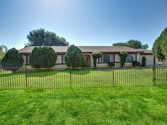 Wonderful family home perfect for all your toys and pets. Great single story with newer roof and appliances, just waiting for your family to put their finishing touches on it. Gorgeous vaulted wood beamed ceiling and curved brick fireplace in the family room that's open to the kitchen. Large living room and formal dining room. Master bedroom with attached full bath. Two other generously sized bedrooms and full bath with convenient door to the back yard. Great for entertaining. Sliding doors take you to a huge patio covered with a low maintenance vinyl patio cover. The lot which is nearly half an acre, is zoned for horses, and slopes down to a community horse trail which you can access by a gate. Two car attached garage with extra wide driveway for possible RV or boat storage. Property is completely fenced.