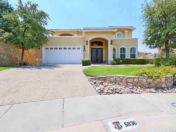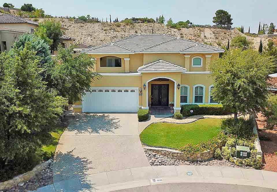 Impressive custom 2 story beauty located on a 9,997 SQFT cul de sac view lot with 5 BDRMS + 4 BATHS! This home features: REFRIGERATED AIR, beautiful foyer with custom mosaic design, formal living/ dining rooms, plantation shutters. Gourmet kitchen with granite countertops, large island, SS appliances, 2 ovens, large pantry, breakfast & office nook. Double french doors leads you to large family room, perfect for entertaining with custom light fixtures, enormous wet bar. Bedroom #2, full BATH & laundry room located downstairs. Staircase with beautiful hardwood flooring and custom wrought iron railing leads you to all other bedrooms. Master bedroom suite with double doors, master bathroom oasis with his/ hers vanities, jetted tub, custom rounded walk in shower, large walk in closet with granite island. Bedroom #3 with balcony overlooking Franklin Mtns. Backyard features: elongated covered patio, built in grill and sink, full bathroom, crisp sparkling pool with jacuzzi, no backyard neighbors, plus much more!