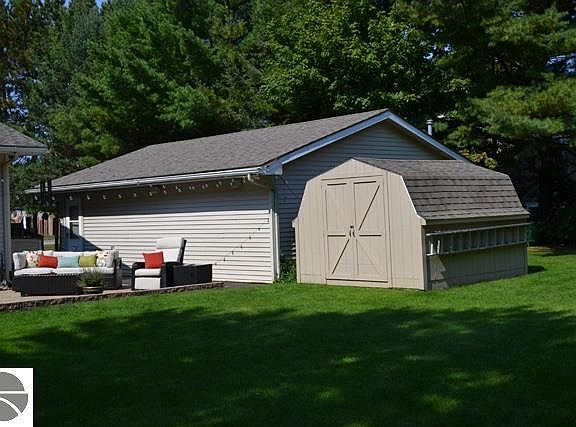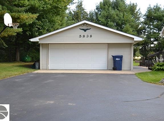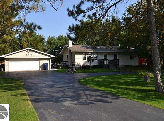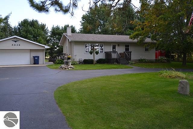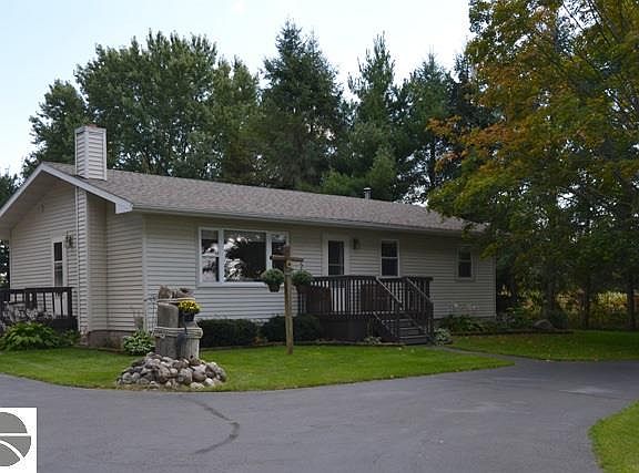 Priced to sell, this lovely west-side 3-bed, 2-bath home (with fourth non-conforming bedroom downstairs) is ready to move into! Minutes from town by hopping on M72, it is in a prime location, and on a lush half acre (with irrigation system), paved circle drive, beautiful landscaping, and lots of privacy with a completely redone deck and back yard area. Baths were both updated this year and house was upgraded from 60 to 200 amp electrical service. The oversized double-car garage is heated with its own propane source. Measurements are deemed accurate but should be verified by buyer.