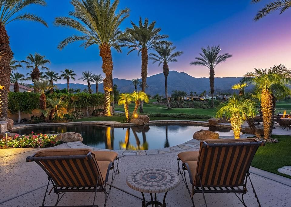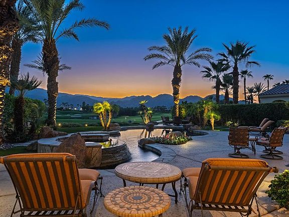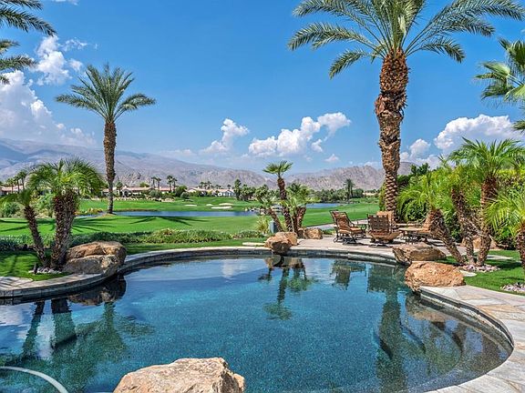 Elevated above the 4th green, this residence captures sweeping South-West views of the Rees Jones designed course, shimmering lake, and the majestic Santa Rosa and Coral Mountains. Step inside to an open floor plan highlighted by elegant travertine floors, crown molding, recessed lighting, and expansive motorized walls of glass that disappear with the push of a button, creating seamless indoor/outdoor living. The gourmet kitchen is equipped with upgraded cabinetry, Wolf/Sub-Zero appliances, two dishwashers, a wet bar, and a morning room that takes in the spectacular views. A temperature-controlled wine room adds the perfect touch for wine enthusiasts, while a dedicated office provides a quiet retreat for work or study. The luxurious primary suite features a cozy fireplace and a spa-inspired bathroom with direct patio access. Guests will enjoy the detached casita, complete with a fireplace in the living room, bedroom, bathroom, and kitchenette. The backyard is a true entertainer's dream, boasting a custom pool and spa, an outdoor kitchen with BBQ, smoker, and bar seating, plus a fire pit to gather around on cool desert nights. A large side yard with a private horseshoe court completes this exceptional outdoor living experience. Come live the life you've always imagined!