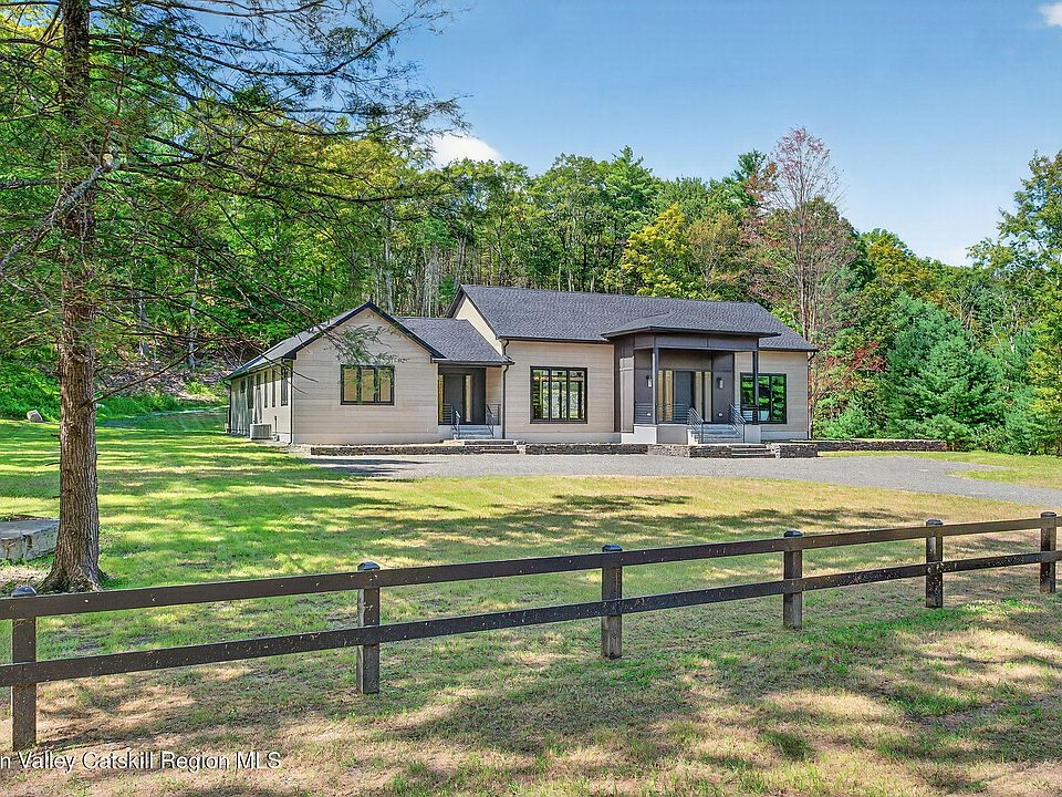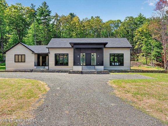 Nestled on 2.9 acres on a country road in Olivebridge, this newly constructed residence offers a harmonious balance of contemporary elegance and the beauty of nature. Spanning nearly 3,000 square feet, this thoughtfully crafted home features 3 bedrooms, 3.5 baths, and a flex space ideal for an office, studio, or den. Each space has been designed with meticulous attention to detail, keeping modern comforts and luxury in mind. Upon entering, you are greeted by soaring ceilings and spaces filled with natural light. Its thoughtful floor plan sets the open concept living space as the heart of the home, perfect for both everyday living and entertaining. The elegant kitchen features a stunning waterfall island, custom cabinetry, stone countertops, and a selection of premium appliances. Light fills the adjoining dining space adorned with a wall of windows. A sleek gas fireplace serves as a centerpiece in the expansive living space. Sliding glass doors open to the back deck, framing panoramic vistas of the forest and a dramatic rock ledge backdrop—establishing a remarkable connection between indoor and outdoor spaces. In its own dedicated wing is the primary suite, where a sunlit bedroom extends to a private deck, a spa-quality bathroom and expansive walk-in closet create the ultimate retreat. At the opposing wing you'll find 2 beds, 2.5 baths, the flex room and laundry room. Each of the bedrooms provide a private sanctuary for residents or guests, with their own luxurious bathrooms and views of the surrounding landscape. For those who work from home or have creative pursuits, the flex space offers the perfect environment to focus and inspire. Whether used as an office, studio, or a cozy den, this versatile room adapts to your needs with ease. Outside, the expansive deck beckons for alfresco dining, morning coffees, or evening gatherings under the stars. With ample space to personalize and create your dream outdoor oasis. In this home, every detail has been considered to enhance comfort and luxury while maintaining a close connection to nature. The use of high end materials and a soothing color palette reflects the surrounding landscape, creating a seamless transition between the interior and exterior environments. With its prime location, this property immerses you in the vibrant life of Hudson Valley. For those who love outdoor adventures, it places you just minutes away from the Ashokan Reservoir, hiking and biking trails, and skiing. Located near the picturesque villages of Woodstock, Phoenicia, Accord, and Stone Ridge where you can explore eclectic shops, gourmet restaurants, cultural happenings, and diverse art forms. Allowing you to experience the finest offerings of the Catskills—all within a two-hour drive from New York City.