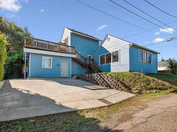 Beautiful 4BR, 1 Bonus Room, 3 BA home with a gorgeous deck featuring serene bay vista views on a corner lot centrally located in North Bend. Downstairs could be a separate living area with a large bedroom, family room, kitchen, bathroom, and utility room. Main living area has a nice living room, spacious kitchen, dining room, and a second utility room. Primary bedroom is upstairs with a bay view, deck, and bathroom with a jetted tub. There is a large detached garage and fenced front yard. This wonderful house has lots of possibilities. Duplex and short-term rental potential! A rare find and great property priced at only $550,000!