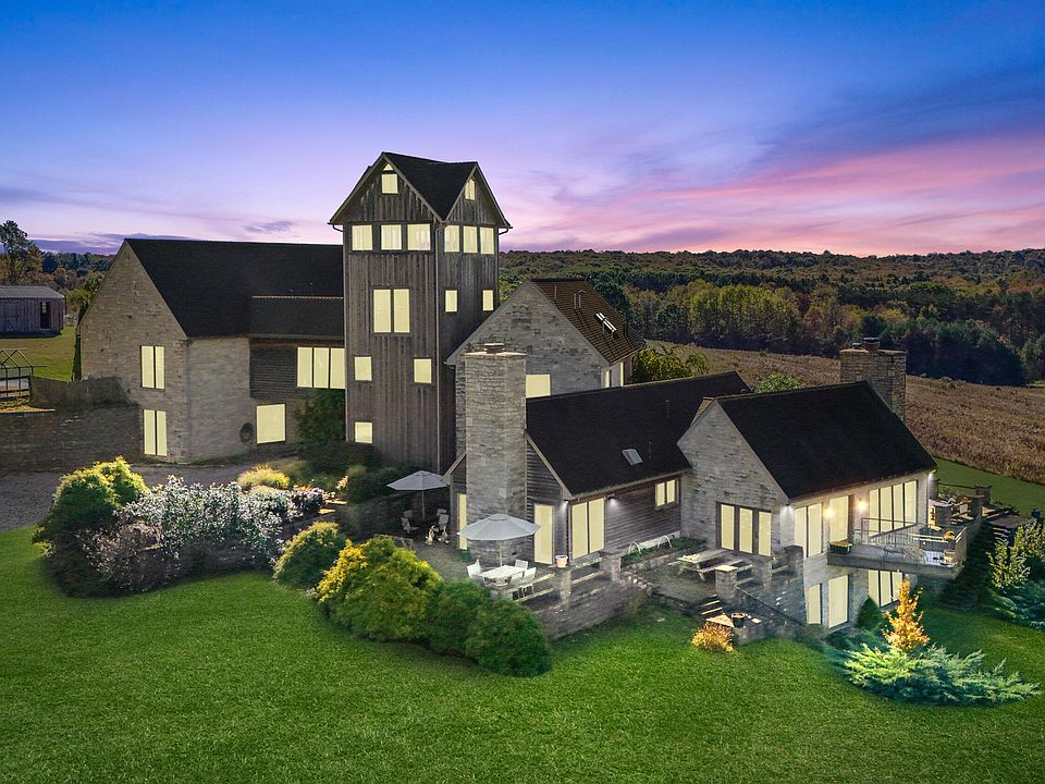 Nestled at 584 McClelland Road in Brookville, PA, this architecturally crafted luxury estate sits on +/- 114 acres of undisturbed countryside, bordered by expansive public lands including Clear Creek State that then connect to the PA State Game Lands, and the Allegheny State Forest. The home offers five bedrooms and four-and-a-half baths, with a striking exterior of cedar and Seneca limestone. Inside, it blends contemporary comfort with refined finishes: American cherry hardwood floors, rubbed bronze chandeliers, two gas fireplaces, and an airtight wood stove in the basement, all beneath soaring 14-foot cathedral ceilings. A centralized music system threads through the home, and a distinctive elevated bridge library links two wings. The residence is designed for grand entertaining and easy everyday living, featuring multiple staircases, a cantilever balcony, and a fourth-floor observation tower/meditation room that delivers sweeping 360-degree views. Outdoors, five Versa-Lok patios invite nature-watching and gatherings, complemented by raised garden beds. Additional structures include a barn, a machine shop, and a storage outbuilding. This estate benefits from proximity to a vast network of natural areas12,000 acres of Clear Creek State, 50,000 acres of PA State Game Lands, and adjacent 500,000 acres of Allegheny State Forestroughly a two-hour drive from Pittsburgh.
