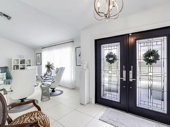 Beautifully updated 3-bed, 2-bath home on a spacious 0.35-acre lot with stunning golf course views. Features include a remodeled kitchen with marble island and stainless steel appliances, large white tile flooring throughout, updated light fixtures, and all-new molding. Enjoy peace of mind with impact windows, sliders, and new front doors, plus an updated electric panel. The expansive primary suite offers his-and-her closets and serene fairway views. Large screened lanai provides ample space for relaxation or entertaining, all while enjoying panoramic golf course views. New landscaping enhances curb appeal and creates a lush, tropical setting. Property has plenty of yard space for a future pool and deck, and generous separation between neighboring homes offering enhanced privacy. Oversized garage adds extra storage flexibility. You will also have peace of mind in this home as it has remained flood-free and includes an AC system enhanced with an air purification system. A move-in ready island retreat—ideal for full-time living or seasonal enjoyment!