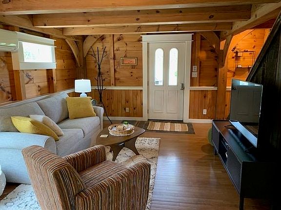 Charming Post & Beam cape and property that is overflowing with gardens, fruit trees and wildlife! The first floor has open concept with your living, dining and kitchen area and sunroom off the back of the house. The kitchen has beautiful wood cabinets, a Gas Range, and a Farmer's Sink overlooking your back yard. There is a full bathroom on the first floor. The 2nd floor is a Large Primary Suite lots of natural light and views of the yard! Suite also has a 1/2 bathroom and custom built in storage. Be on the look out for the many beautiful stained glass accents hidden throughout the home. The home has radiant heat in the partially finished basement and 1st floor and efficient hot water heater. There are outbuildings for all of your needs, including storage, work space, chicken coop and goat house! Home is minutes from Rt 12 and the Walpole Village and I-91. Has recently been used as a very successful short term rental with significant income potential. Hot tub is negotiable.