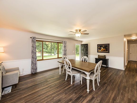 Updated floor plan with new painting, flooring updated kitchen with stainless steel appliances and shaker cabinets. The Family room has a wall of windows and a gas log fireplace leading out to a newer concrete patio with a retractable awning. The 40 X 20 outbuilding has three-car garage doors with openers plus the two-car attached garage. The wooded acre lot has a new cedar fence and a circle drive in the back for additional parking. The rec room has new carpeting paint with a wood-burning fireplace and additional storage and newer Furness and hot water tank. You will enjoy the privatize and located just north of the Lakes Country club