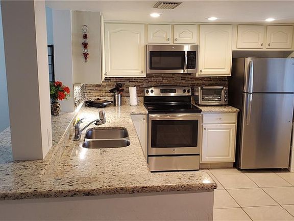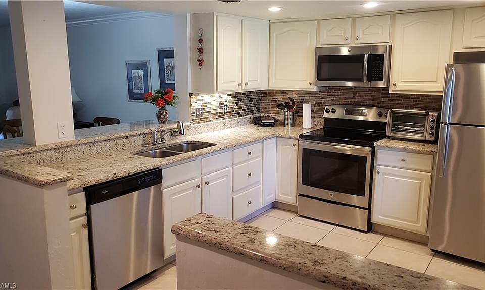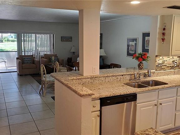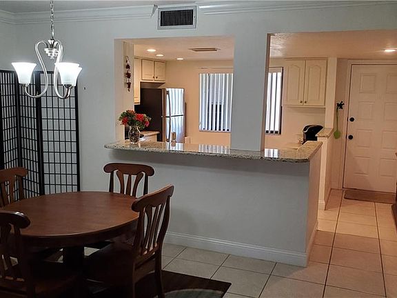 Meticulously maintained sought after First Floor over-sized End Unit. Beautiful large open kitchen with granite counter tops and stainless steel appliances. Unit features tile throughout the entire unit and carpet on both bedrooms. Crown molding in living area. The AC, hot water heater and the appliances are about 4 years old and well maintained. Large master bedroom with walk-in-closet. Master bathroom has granite counter top and full size shower. The guest bathroom has the combo tub and shower. Sit in your enclosed screened lanai and enjoy the peaceful tranquility and gorgeous view of Royal Palm Golf Course (currently being renovated with new sod). The lanai has a storage closet. Unit comes with an assigned covered parking space with a private storage at the back of the closed in carport. Plenty of guest parking. Separate laundry room inside the home. Basic cable and water are included in the quarterly association fees. Walking distance to a very private community pool surrounded by landscape. Close distance to supermarkets, restaurants, downtown Naples, Beaches and shopping malls. Service dogs with the proper paperwork are allowed.