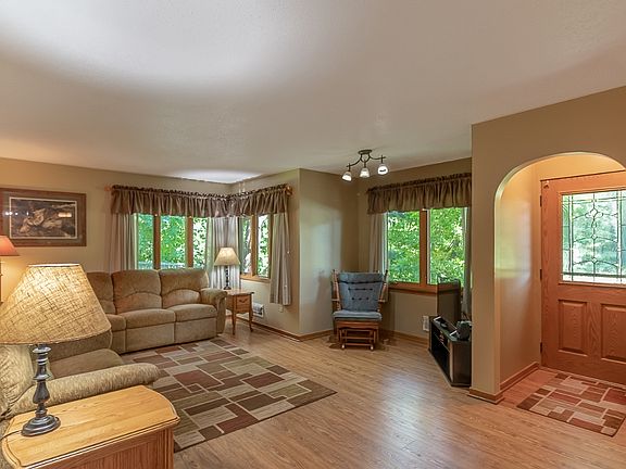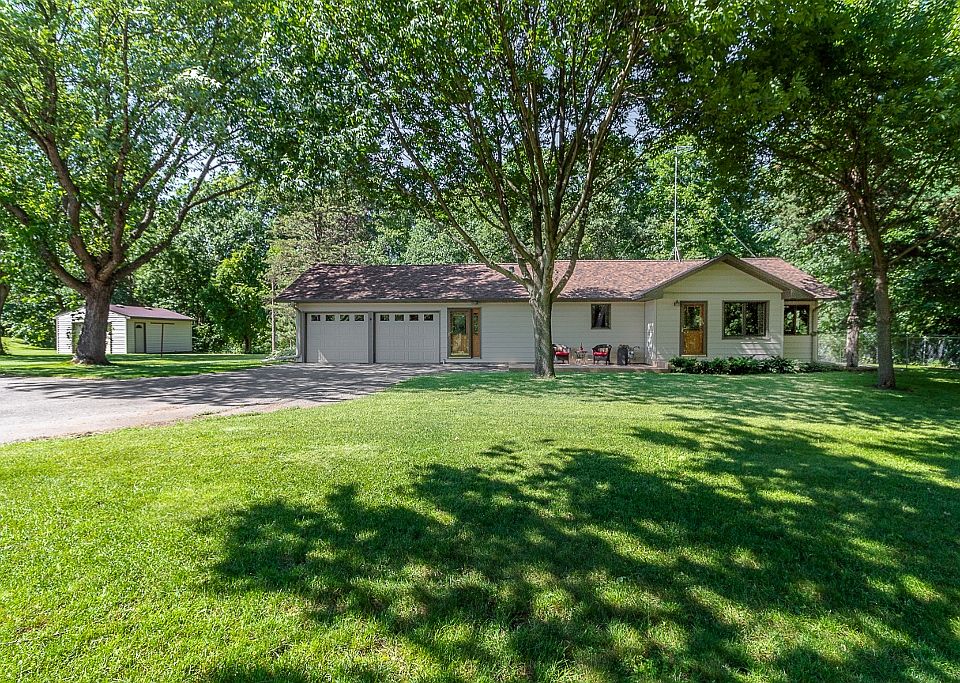 Country living and close to town - the best of both worlds! The front entryway offers a convenient coat closet and arched doorway leading to a spacious living room and informal dining area. Durable hard surface flooring runs throughout these spaces creating a cohesive feel. The kitchen boasts ample cabinetry and stylish, modern lighting before leading to the mudroom area with garage access as well as sliding patio doors to the backyard and an open staircase to the full basement. There are two bedrooms on this level and a full bathroom. Downstairs you will find a newly finished family room with recessed lighting, 3rd bedroom with egress window, and brand new 3/4 bathroom with corner shower. Outside you will find plenty of room to roam on this beautiful 4.12 acre lot! There are tons of mature trees, a detached 16 x 20 shed, large fenced area, back patio as well as a raised deck/porch in the front of the home. Additional notable items: new roof in 2017, compliant mound septic system, newer Andersen windows, Complete Basement System installed, private well, move-in ready -- this is it!