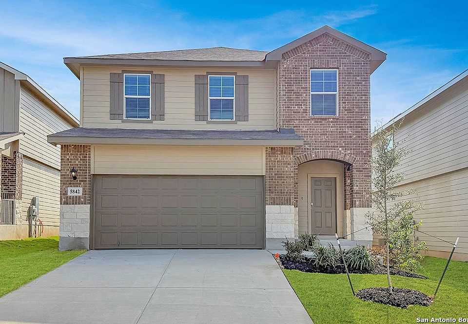 Step into The Grace floor plan at Stonehill in San Antonio, TX. This home showcases 2 classic front exteriors, full yard landscaping and irrigation and a 2-car garage. Inside this 4 bedroom, 2.5 bathroom home, you will find 1952 square feet of living space designed to meet your needs. The arched front patio opens to a grand foyer which then leads to a spacious living room. The living room blends seamlessly into the kitchen and dining area in an open concept floorplan. Your kitchen is built for the ultimate home chef and offers quartz counter tops, stainless steel appliances, and a kitchen island overlooking the living room. Don't forget a deep, single basin kitchen sink for convenience and ease. The staircase leads to the upstairs main bedroom suite, all secondary bedrooms, and your utility room. The Grace floor plan is ideal if you want to keep your entertaining space and private space separate. The upstairs main bedroom has an attached bathroom that includes a tiled walk-in shower, separate water closet and plenty of storage space with built-in shelving and a grand walk-in closet. Additional features of this home include sheet vinyl flooring in the entry, living room, and all wet areas, quartz countertops in all bathrooms and our HOME IS CONNECTED base package. Using one central hub that talks to all the devices in your home, you can control the lights, thermostat and locks, all from your cellular device.