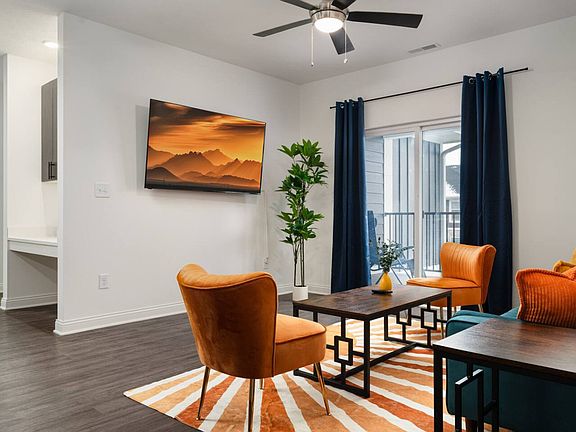 This modern apartment is designed for comfort and functionality with an open-concept layout and soaring 9' ceilings. The kitchen boasts stainless steel appliances, quartz countertops, and a walk-in pantry. Large windows and ceiling fans are found throughout, and the apartment includes a smart thermostat and electronic door key system for added convenience.