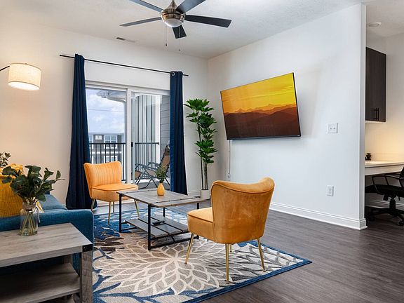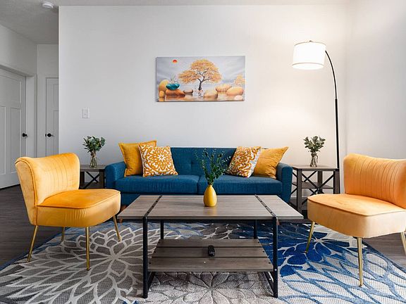 This modern apartment is designed for comfort and functionality with an open-concept layout and soaring 9' ceilings. It boasts stainless steel appliances, quartz countertops, and a walk-in kitchen pantry. Large windows and ceiling fans enhance the space, while a smart thermostat and electronic door key system add convenience. The apartment also includes custom entryway storage with a coat rack and a large private patio or balcony for outdoor relaxation.