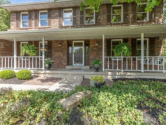 Experience the allure of this traditional 2-story brick home on an acre of land. The spacious interior boasts a living room, dining room, and a large eat-in kitchen with natural wood and granite countertops. Enjoy the cozy great room with a gas fireplace and hardwood floors throughout. The primary bedroom features an adjoining bath with a vanity and walk-in closet. This inviting property includes a finished basement, a heated in-ground pool, and a secluded