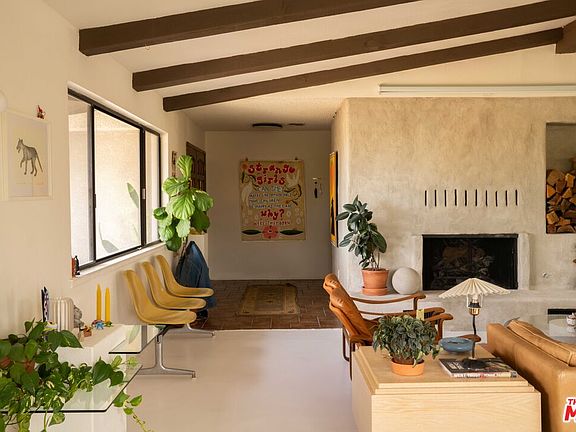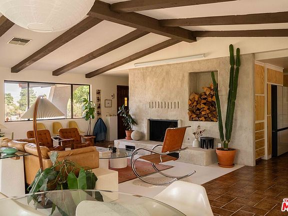 The House on Joshua Lane. South of the highway towards the end of the road you'll find this sweet Spanish villa just outside of Joshua Tree National Park. This 1980's home in upper Sky Harbor still has cool original elements like a dramatic floor-to-ceiling fireplace, sun room that stretches along the length of the home with over 200 square feet of space and a very 80's stone brick wall bathroom. All the while, it's been upgraded in all the right places. Meticulously loved and renovated, the large double front door opens into a proper entry way that splits the living space and the rest of the home. Go left and get swept up by the vaulted ceiling with exposed beams and an expansive living area. The fireplace commands your attention; refinished with a concrete overlay, a built-in bench and fire log display; it becomes the focal point of the room. The living room has been thoughtfully arranged to have multiple spaces. Cozy up around the fireplace or watch movies on the mounted projector, move to the seating area to dive into a good book or listen to a record, or make yourself a drink at the built-in drybar. The kitchen has been refreshed with new cabinet faces, new appliances, and open shelving. The window behind the sink opens to bar seating inside the enclosed sunroom, a fun hosting feature for your friends! The open concept allows for plenty of space for a dedicated dining area or take it outside for alfresco meals under the covered patio. On the other side of the home you'll find two spacious guest bedroom, guest bathrooms, and the expansive primary suite. The primary bedroom is on the south side of the home with sliding glass doors to the enclosed patio, a full bathroom with double sinks plus a large walk-in closet. Find the half bath in the entry hallway with an unforgettable stone brick wall, upgraded lighting fixtures and Moroccan tile. There is an intuitive flow around the home making it the perfect place to host or welcome a full family. The property is fully fenced and situated on the lot for privacy and beautiful sunrise and sunset views. The home is surrounded by mature shade trees that help keep the lot cool plus a new HVAC system. There is an attached two car garage with laundry, tankless water heater and storage as well as a large RV garage toward the back of the 1.4 acre lot. Joshua Lane is perfectly placed for convenient access to everything in Yucca Valley or Joshua Tree while still feeling like the perfect desert retreat. You're just 10 minutes to The Copper Room, Tiny Pony + Desierto Alto, Frontier, The Dez, and so much more.