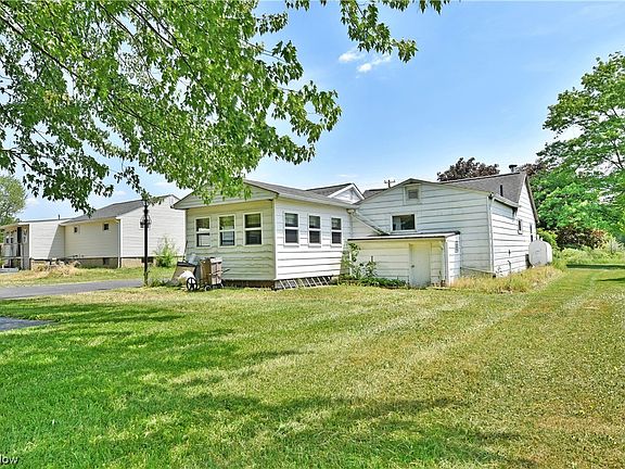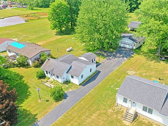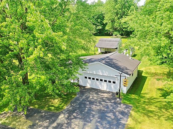 Perfectly cozy with plenty of room to grow, this lovely semi-rural, two-bedroom Leavittsburg home offers up tons of potential! The expansive, tree lined lot includes a substantial blacktop drive leading up to an impressive cement floor garage, oversized with additional shop space and rear garage door entry. A second and third storage unit are located further behind. The pent roof covered front porch reveals the formal entryway. Inside, a spacious carpeted living room is trimmed in natural woodwork. At the far corner, a pair of impressive bedrooms reveal their illustrious and window lined living space with hardwood styled flooring running below. The larger of the two offers a large closet with built-in shelving. Opposite the living room, a full bath is found before opening to the boldly colored kitchen. Handsome wood cabinetry lines the outer walls with stone-look countertop below. First floor laundry is located nearby as the finished sunroom awaits behind a pair of French doors. Call t