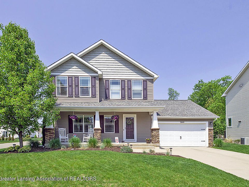 *******Welcome to 5849 Chartres Way*******Why build when you can move right into this beautiful like new located in the desirable Chateau in the Pines community! You will love the open and airy feeling this 3 bedroom home offers. From the moment you walk onto the covered front porch and into the entry foyer you will feel right at home. First floor features include an expansive living room, equipped open kitchen with appliances included plus an eating area with a sliding glass door to the backyard patio. Generous upstairs bedrooms including a private primary bedroom and bathroom. A partially finished lower leve with a half bathroom, attached 2-car garage, large pantry area off the kitchen and second floor laundry are added bonuses. Just minutes to shopping and the MSU campus.