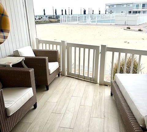 Gorgeous Dune Road Oceanfront at Luxurious Westhampton House! Renovated 2 bedroom, 2 bath unit, sleeps 8, with beautiful custom kitchen with island seating and wine refrigerator. Large open layout for your entertaining pleasure. Wonderful patio out to pool, with direct access to sand and walkway to beach. Designed with perfection, this will not last. Pretty furnishings with large sleeper sofa queen couch, light airy space and very clean. Lifeguarded ocean beach, dock on bay side, very nice gym, community room with kitchen, bbq grills, laundry room(2), business center, elevator, and full-time live-in manager. August $30,000