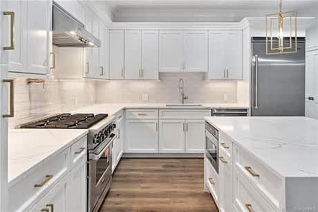 At the heart of the home, the gourmet kitchen shines with Viking appliances, sleek quartz countertops, and a dramatic waterfall-edged island that doubles as a stylish centerpiece.