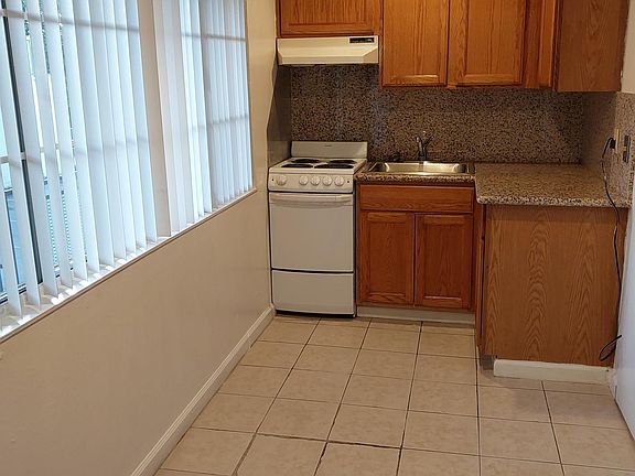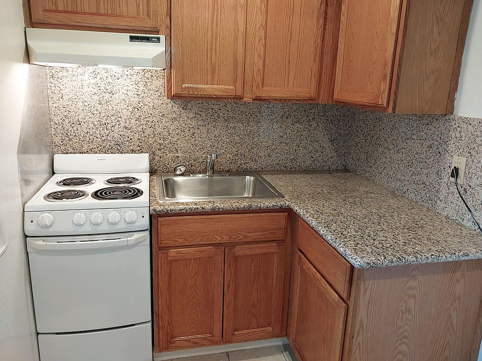 12 unit complex. 2nd floor studio unit about 400 sqft. All electric kitchen with stove and vent hood, refrigerator, and plenty of cabinets. Bathroom has shower over tub.