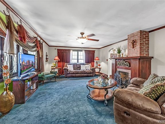 Prettiest house in Lackawanna! Nearly 3300 sq' - 3 bedrooms, 2 full baths, plus 2 half baths, plus more living space (in law possibilities or office space 789 sq') in lowest level w/ walk up doorway to outside. Every room is charming. Liv rm has newer carpet - '23. Stunning brick and carved wood gas fireplace. Open concept kitchen w/ pantry closet, french door to side covered veranda leading to gardens. Newer vinyl tile floor. HW in dinette area and most of home. 31x16 Fam rm w/ wet bar, french door leads to huge covered patio. Kitchen appl. stay in lowest level. Backyard driveway access is by way of city easement drive off Franklin St. Fully fenced yard w/ fire pit for summer entertainment. Highest and best offers due Fri, 6/21 @ 5pm. Square footage differs, professionally measured by an appraiser.