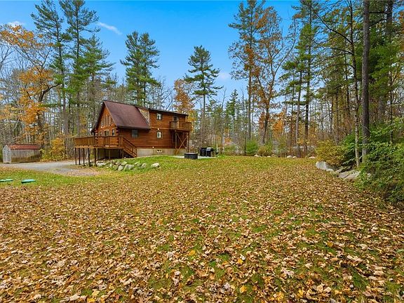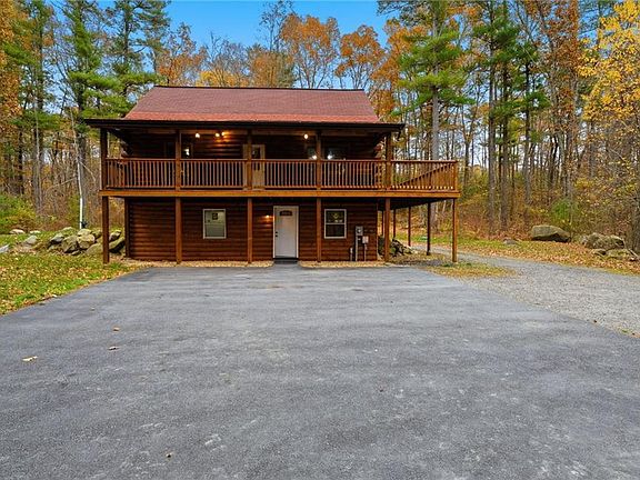 Move into your new home in time for the holidays! Tucked away on 2 acres of wooded tranquility, this beautiful log home combines rustic charm with modern comfort. The inviting open-concept living area features cathedral ceilings, Anderson windows, and sliders leading to a wrap-around deck—the perfect spot to enjoy the peaceful views and fresh country air. Recent updates include Pergo Outlast waterproof laminate flooring throughout the main living area, fully renovated bathrooms with all new fixtures including LED backlit mirrors, new Samsung stainless steel appliances, updated fixtures throughout, and a brand-new boiler with Rinnai propane water heater combo for efficiency and peace of mind. The main level offers two comfortable bedrooms and a full bath, while the private lofted master suite serves as a relaxing retreat, complete with a full bath with a tile walk-in shower, and balcony deck overlooking acres of trees. The lower level features two finished rooms tastefully completed with new paint and LVP tile flooring, ideal for a home office, gym, or guest space, plus ample storage options, making this home truly move-in ready. A perfect blend of natural beauty, thoughtful updates, and timeless craftsmanship—come experience the warmth and serenity of this exceptional log home.