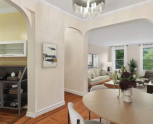 Enter through a welcoming entry foyer and you are drawn into the sunken living room grounded by pretty basket-weave floors and accented with subtle Deco moldings. The space quite generously accommodates a gracious seating area plus dining or home office as well.