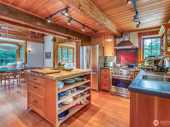 Discover this lovingly cared for craftsmen/log cabin compound on 6+ sunny acres, featuring a guest cottage with a rare vacation rental permit and a detached office. Surrounded by mature gardens and a thriving orchard, this private retreat blends rustic charm with modern convenience. The original cabin boasts a vaulted great room, loft, new Scandinavian woodstove, and chef’s kitchen with GE Monogram range. French doors open to a large deck for summer entertaining. The 2011 wing addition includes a primary suite with ensuite bath and secluded deck. Enjoy raised garden beds, roses, blueberries, and flexible outbuildings for guests or creative use. Private wells, sheds, updated septic, and convenient ferry access complete this must-see oasis.