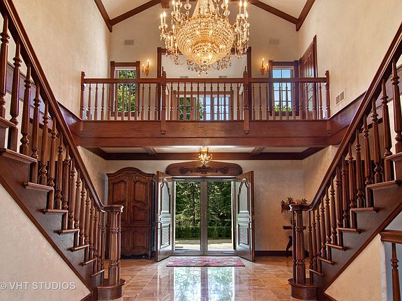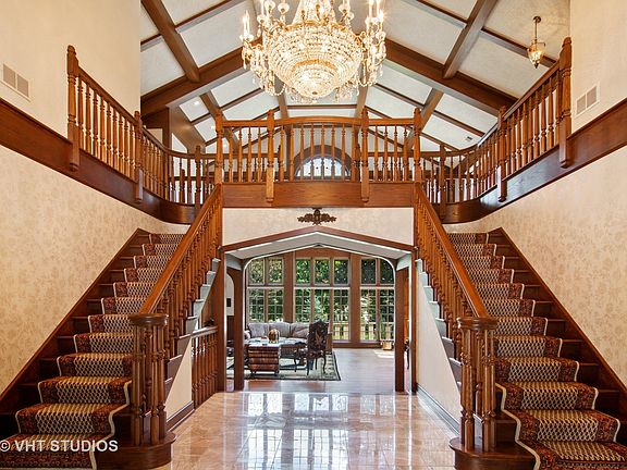 This custom luxury home was built with ton of thought, glamorous woodwork and details throughout. Stepping into this welcoming double staircase foyer will give this home the welcome your guests deserve. Coffered ceilings with stunning wood beams and two story family room with endless views of yard are all perfect for entertaining. Main level master suite with endless amounts of closet space and spacious private bath. Additional en-suites on 2nd floor, all with hardwood floors and walk in closets. Elegant dining room with tons of trim and wood floor details. Walnut paneled study with built-ins and fireplace. Expansive mud room leading to back stair case. Elevator with access to 2nd floor. Entertaining in the full finished basement with sunken full bar, fire place and wine cellar, is perfect for those large gatherings. Sitting on over 2 acres of land with a wrap around brick driveway and private sought after community.