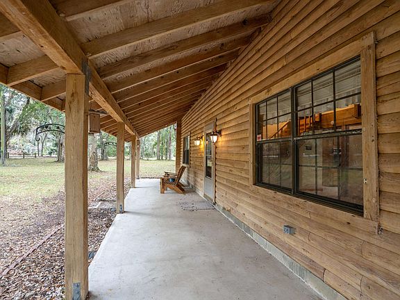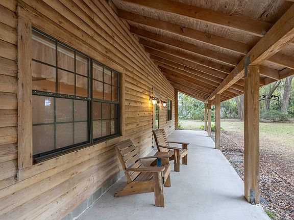Nestled on a picturesque 1.77-acre homesite, this charming two-bedroom, two-bath log cabin home, built in 1985, offers a rustic retreat. As you approach the circular drive, you're greeted by the beauty of stunning oak trees surrounding the property. Step inside to vaulted ceilings with exposed wood beams and exquisite tongue-and-groove detailing. The living room boasts a coquina gas fireplace, perfect for cozying up on cool evenings. The kitchen includes a convenient pantry closet and flows effortlessly into the bright, sun-filled dining room. Downstairs, you'll find a spacious guest bedroom with laminate flooring, a walk-in closet, and access to a large guest bathroom. Upstairs, the primary bedroom is a tranquil escape with vaulted ceilings, wood beams, and an en-suite bathroom featuring a shower stall. The home also features a detached 1-car garage, a four-car/ RV/ boat carport, and a shed for extra storage. Enjoy peace of mind with a brand-new roof installed in November 2024. Relax on the covered front or back porch or around the cozy fire pit, perfect for soaking in the tranquil surroundings year-round. Conveniently located just 15 minutes from Vilano Beach, only 6 miles from downtown St. Augustine, and a quick 13 Miles to Jacksonville, this property offers the perfect blend of rustic seclusion and easy access to coastal living and historic charm. This home is a rare find, blending cabin charm with the peaceful beauty of nature!