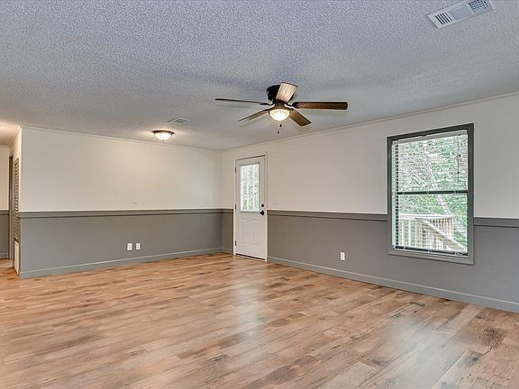 Nestled on 2.4 acres, this updated home offers the perfect blend of charm, privacy, and space. A large living room with built-in shelving flows seamlessly into the kitchen, which features cheerful cabinetry, butcher block-style counters, a farmhouse sink, and a cozy dining area. Fresh flooring runs throughout the main living spaces, adding warmth and character.
