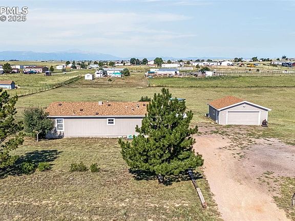 Welcome to your Colorado dream property! Nestled on 3.6 fully fenced acres in Sagecreek South, this charming home offers breathtaking Front Range and Pikes Peak views, with spectacular sunrises and sunsets right from your backyard. Inside, you'll find a bright and open floor plan featuring vaulted ceilings, 2 spacious bedrooms, 2 full bathrooms, and a dedicated office or den—perfect for working from home or flexible living. Thoughtfully updated for comfort and peace of mind, this home includes a newer roof, furnace, AC, hot water heater, and a whole-house water filtration system. Outside, enjoy an oversized detached garage, multiple outbuildings, and room to garden, roam, or bring your animals. With no HOA, RR-2.5 zoning, and space to grow, this property offers rare freedom and functionality. Don’t miss this move-in-ready gem with unmatched value, views, and versatility!