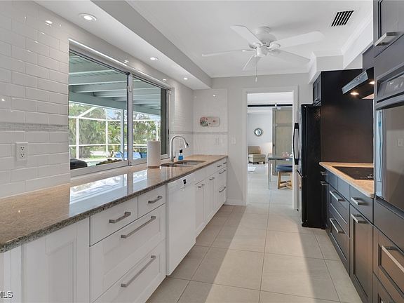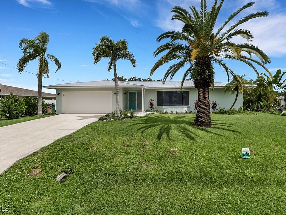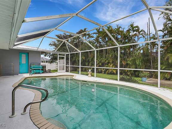 NEW METAL ROOF 12/22! WATER AND SWER IN AND PAID IN FULL! Beautifully maintained and updated 3/2/2 pool home in the prettiest part of Cape Coral. Offered turnkey and furnished in a very tasteful and tropical style. The over sized corner lot curb appeal starts with the mature, tropical landscaping, and extends to the pavered extra parking spot in the rear. Extra high elevation means the home never flooded. Modern and updated kitchen with two toned cabinets and plenty of storage space. Quartz counters and appliance package match the custom backsplash, and large pass through windows to the lanai make entertaining and clean up a breeze. Large covered lanai and spacious pool are are the perfect place to enjoy the weather and entertain family and friends. Owner's suite features large sliding glass doors to the pool area, bring in lots of natural light, and a large fashionable barn door leads to the updates contemporary bath. Updated guest bathroom doubles as the pool bath. Newer water heater, paint and updated lighting fixtures round out this beautiful remodel.