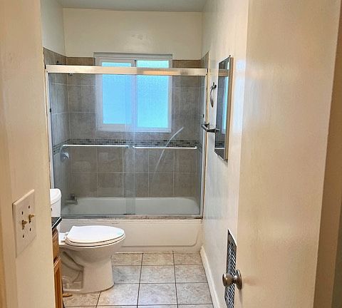 Central hall bath with glass tub enclosure and tile floors. THe unit has double pane windows through out. The four unit is complex is located close to restaurants, and public.
