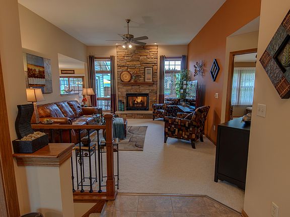 STUNNING Rolling Fields Split Ranch! Features include; open concept, 10' ceilings, gorgeous stone surround gas FP, floor to ceiling windows, stainless steel appliances, breakfast bar w/dinette, private stone paver patio/deck, gazebo nook, den/office (could be used as 4th BDR), expansive master suite w/soaker tub/shower stall, walk-in ''dream'' closet off master bath, entertaining finished basement with game/work-out/movie/kitchenette areas, 3/4 bath w/ roomy walk-in shower, and plenty of additional storage. Solid 6 panel doors, granite countertops, ceramic tile, updated fixtures & ceiling fans throughout. The immaculate 2.5 CAR garage w/work counter & cabinets walks out to the beautifully landscaped yard including an abundance of perennials, shrubbery, sprinkler system & garden shed.