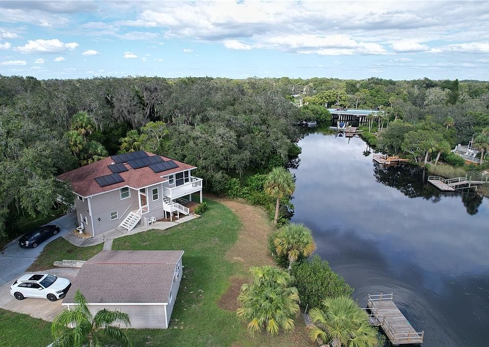 RIVER FRONT LIVING WITH "GULF ACCESS" AT IT'S FINEST! STUNNING VIEWS OF THE COTEE RIVER. Located at the end of a private cul de sac 1 mile from downtown New Port Richey, you won't want to miss this open spacious two story 5 bedroom, 3 bath, 4 car garage home sitting on a .28 acre lot with 100 feet of River frontage. With almost 3000 square feet under roof, 1872 sq ft of upstairs living the rest downstairs. Upstairs you will find the Great Room, Primary Suite, Kitchen, 2nd bedroom with private balcony and guest bathroom. The open airy Great Room features cathedral ceilings and sliders out the large wrap around outdoor deck with views of the River. The kitchen features granite countertops, soft close cabinets with updated hardware, stainless steel appliances, closet pantry and a large eating area. The primary bedroom has lots of natural light, a large walk in closet and sliders to the back deck. Downstairs are 3 bedrooms, a Jack & Jill bath, separate laundry room, access to the outdoor downstairs covered porch and garage. Additional features include new paint throughout the entire house, a 576 sqft. 2 car detached garage with extra parking pad, newer hot water heater, solar panels,(Significant electric bill savings) double leaded glass front door and new ceiling fans. Enjoy fishing for tarpon, snook or drum from the large floating dock or kayak a short distance to a Nature Preserve. Power boat suitable. This is a golf cart friendly neighborhood. No HOA.