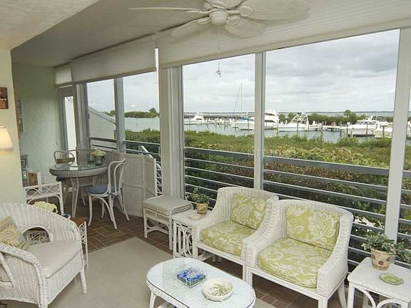 Enjoy the morning sun in this waterfront, 2 bedroom 2 bath condominium. This first floor, split plan presents numerous upgrades including newer kitchen, crown moldings, tile floors, built in cabinets, wind-rated sliding glass doors and comes delightfully furnished. Marina and bay views from nearly every room with spacious waterfront Florida room. Boca Grande Club amenities include tennis, work out facility, private restaurant, beach access, on site management and more. One time initiation fee of $10,000 and yearly dues of $2,910.