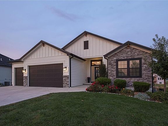 Welcome Home! Get all the perks and style of new construction, PLUS all the extras that have already been added. This like-new 4-year-old home features upgrades like a screened-in composite deck, extended patio, fenced yard with gate to the ponds, beautiful raised garden beds, the addition of a custom built basement wet bar and built-in wall entertainment area, custom-fit Hunter-Douglass blinds and window treatments, and garage wall mount system.  It's already done and included!  This reverse 1.5 story McKinley Cottage by First Choice Custom Homes also offers a beautifully open kitchen with SS appliances, including a gas range and walk-in pantry, extra tall ceilings, hardwood floors, and a stone fireplace. The main floor master bedroom offers tray ceilings, a huge shower, and walk-through closet to the laundry room and hallway.  From there you'll find another full hallway bath and bedroom.  Natural light floods both the upstairs and the walkout basement, where you'll find two more large bedrooms, another full bathroom, and storage space galore. Located in desirable Canyon Lakes, this home is close to great schools, shops, dining, parks, neighborhood fishing ponds and golf courses. With its combination of indoor charm, outdoor living spaces, and functional, stylish upgrades, this home is ready to welcome its next owner.