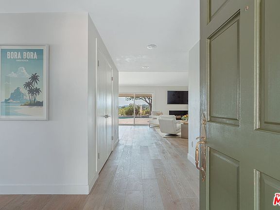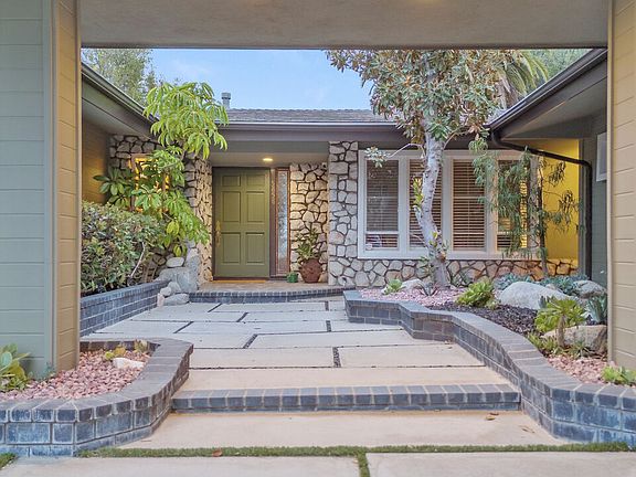 This Mid-Century stunner, in coveted Carlton Terrace, is perched near the crest of the street with sweeping valley and mountain views. Originally built in the 1950s by the neighborhood's developer for himself, this 3,000+ sq ft single-story home on a large private lot blends history, style and entertainer's appeal. Vaulted ceilings and wide plank hardwood floors frame sunlit, open living with designer details, including recessed lighting, built-in speakers and modern updates throughout. The sun-drenched kitchen shines with quartz counters, stainless appliances, custom cabinetry and a breakfast nook, while the adjoining dining room and living room boast panoramic views. The primary retreat features vaulted ceilings, a walk-in closet and a spa-like bath with dual vanities, honed marble tile and a rain shower with a picturesque view through privacy glass of the back yard. Two additional bedrooms with loads of closet space and built-ins share a sleek Jack-and-Jill bath. The family room, which could easily be converted to a 4th bedroom, is wired for surround sound, with a neighboring powder bath and large laundry room with hidden door. The outdoors of this special property are private and sprawling with a classic kidney shaped pool, ever-green yard, new paver patio and endless views. Situated on a street-to-street lot, the oversized garage offers parking for 2 cars plus additional storage. Close to all that's happening in Woodland Hills and Calabasas, with easy access to the 101 and beyond. This property is a truly modern oasis!