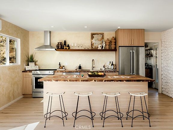 Sawtooth Sanctuary: Perched on the edge of the Sawtooth Mountains, this fully reimagined 2-bed, 2-bath retreat captures sweeping views across Yucca Valley and Joshua Tree. Bright and airy interiors showcase abundant natural light, with seemless flow from interior living to outdoor entertainment. Completely re-designed with high-end finishes, the home showcases abundant natural light, a striking German schmear pebblestone wall in the new kitchen, wraparound fluted travertine tile in the bathrooms and smooth Venetian plaster throughout. Every detail has been considered, blending modern elegance with desert soul.