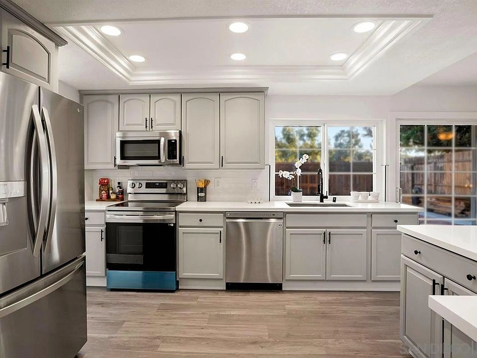 Gorgeous 5 bedroom remodeled home w exposed beams in LR & FR, grand double-height vaulted ceilings in entryway are sure to impress. Full-length windows climb to 2nd story. Flooded w natural light. Fully updated kitchen w/ SS appliances, white quartz counters, grey cabinets, & recessed ceiling w/ canned lighting. Large windows provide an open & inviting feel. Family room looks out to spacious yard. Downstairs bedroom adjacent to half bath, features bay window. Retreat upstairs to spacious master suite w/ dual closets & French doors out to charming balcony. Fireplace in LR. Attached 2-car garage.