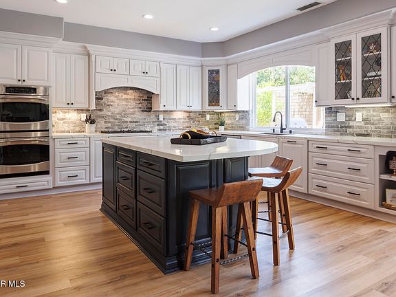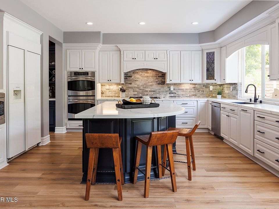 As you walk through your garden, considering which fruit tree or herb to pick, you're bound to smile knowing that whatever you leave behind today, you'll surely collect tomorrow. Peaceful is a word that comes to mind when describing this massive nearly 4300 SF, 6 bed, 4.5 bath home, high above it all, in the east Simi Valley community of Shadow Hawk @ Indian hills. Located on a fabulous corner, adorned with the Shadow Hawk monument informing visitors they've arrived, is 5859 Evening Sky Dr., so called because at night you'll feel as if you could touch the stars. Inside, every room is spacious. For formal entertaining there's a perfect dining and living room with a towering coffered ceiling. But let's face it, we live in the great room and what a great room there is! The redone kitchen is quite literally breathtaking. The rich white and blue millwork exude a refined elegance with a plethora of drawers which are always preferred to doors, while the used multi colored brick backsplash is reminiscent of a turn of the century farmhouse. This is accentuated by a sprinkling of leaded glass cabinet doors, black hardware in the kitchen and butler's pantry with wine rack and coffee bar. The grand quartz island with the meandering radius, is perfect for bar stool casual dining and for the chef there's fabulous stainless steel appliances, a 42 inch built-in fridge and a decorative commercial hood. The nook and family room are so large, there's room for a breakfast table, a billiard or foosball table and a huge sectional along with a wall for a massive 85''TV if that's your style and taste. The luxury vinyl floors compliment the farm to table feel of the home (but if you prefer travertine, it's still underneath!) With 6 bedrooms, you can imagine there's literally room for everyone. With a full ensuite down, your guest or elderly family have the perfect resting spot, while upstairs the bedrooms are fantastic. The primary is vast and allows the owner to furnish it with a sitting area or cozy den for late night TV, while the bath is highlighted by a shower large enough for two. Both rooms offer lovely hilltop views. All the secondary bedrooms are spacious but bed 6 is oversized and can serve as a bonus room, gym, music studio or sensational office. With a 3 car garage and a level street with no neighbor across, there's ample parking and even room for boat or trailer on the side. Additional amenities include a captivating crystal entry chandelier, a built-in BBQ and bar, drought friendly turf in the rear and a gate to the common area slope where you'll find lemon, fig and other delectable fruit varieties. Shadowhawk features low homeowners dues and is close to fabulous hiking trails, nature, the 118 fwy and the San Fernando Valley.